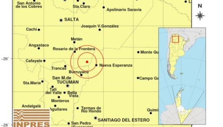 Este lunes el Inpres registró un sismo en Salta a las 13.34 de la tarde de 4.8 en escala Ritcher. El temblor tuvo una profundidad de 10 kilómetros. Mientras que el epicentro se registró a 103 km al NE de San Miguel De Tucumán; 167 km al SE de Salta; 33 km al O de Nueva Esperanza -26.100 (lat) -64.550 (long), cerce del límite con Tucumán.