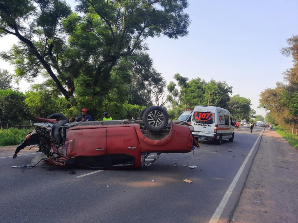 Producto del impacto, el Corsa quedó con todo el tren delantero destrozado, a la vera del camino, mientras que la Nissan Frontier terminó volcada sobre la ruta 304.