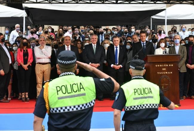 El presidente, Alberto Fernández, y el gobernador Osvaldo Jaldo encabezaron este viernes la entrega de 100 camionetas 0 km destinadas a la Policía de Tucumán, durante un acto realizado en la explanada de Casa de Gobierno. Además, firmaron convenios para la financiación de $600 millones para la construcción de dos alcaidías en el interior a fin de solucionar la crisis carcelaria.