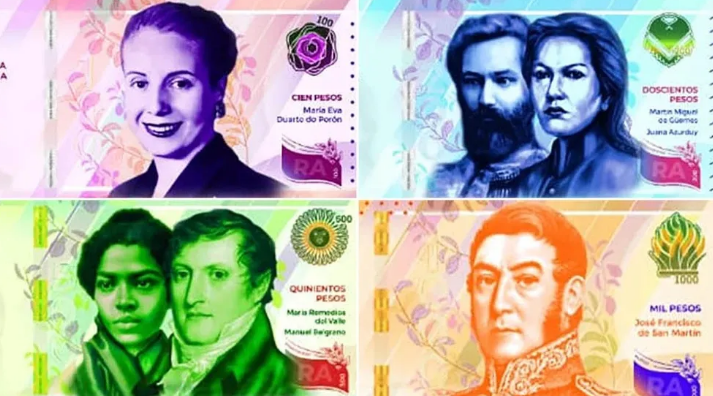José de San Martín, Eva Duarte de Perón, Martín Miguel de Güemes, Juana Azurduy, Manuel Belgrano y Remedios del Valle son los rostros elegidos para los billetes. Además, en sus dorsos, tienen postales de hechos trascendentales protagonizados por esos personajes.
