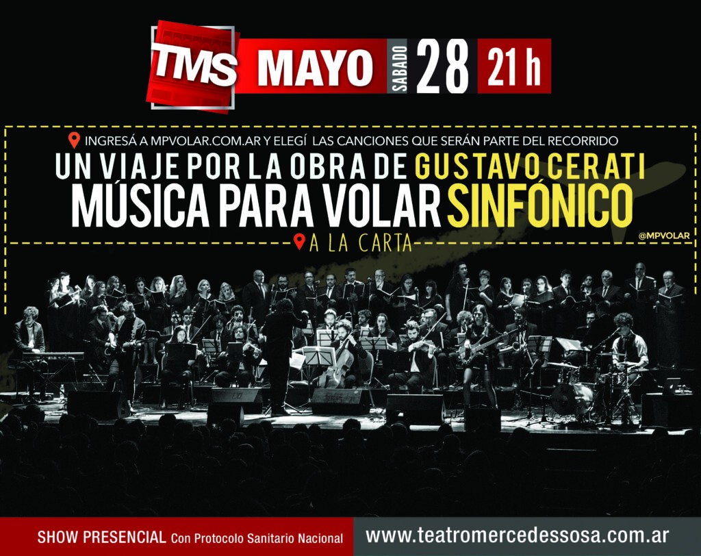 Este sábado 28 de mayo a las 21 horas, el proyecto Música para volar (MPV) brindará un show en el Teatro Mercedes Sosa. Con banda, orquesta y coro polifónico, el grupo musical presentará “Cerati sinfónico a la carta”.
