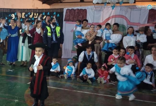 Acompañados por sus padres y vestidos de época, los pequeños que asisten al jardín materno infantil “Los Pollitos Azules” emocionaron a las autoridades del Ministerio de Seguridad y de la Jefatura de Policía durante el acto que se celebró este miércoles con motivo de un nuevo aniversario de la Declaración de la Independencia.