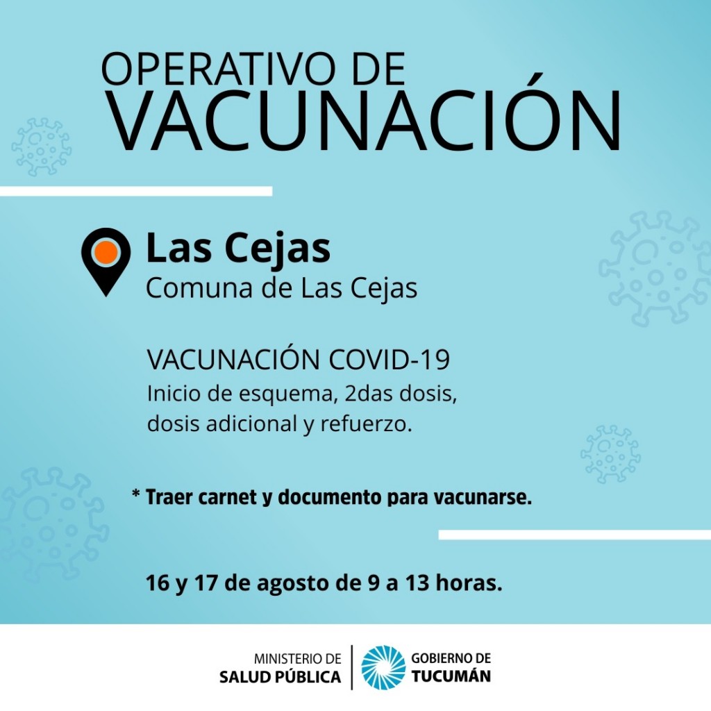 El Ministerio de Salud Pública, a cargo de Luis Medina Ruiz, informó que del 16 al 17 de agosto, de 9 a 13, un móvil de inmunización brindará sus servicios a la población en la comuna del lugar para completar cronogramas de vacunación contra el Covid.