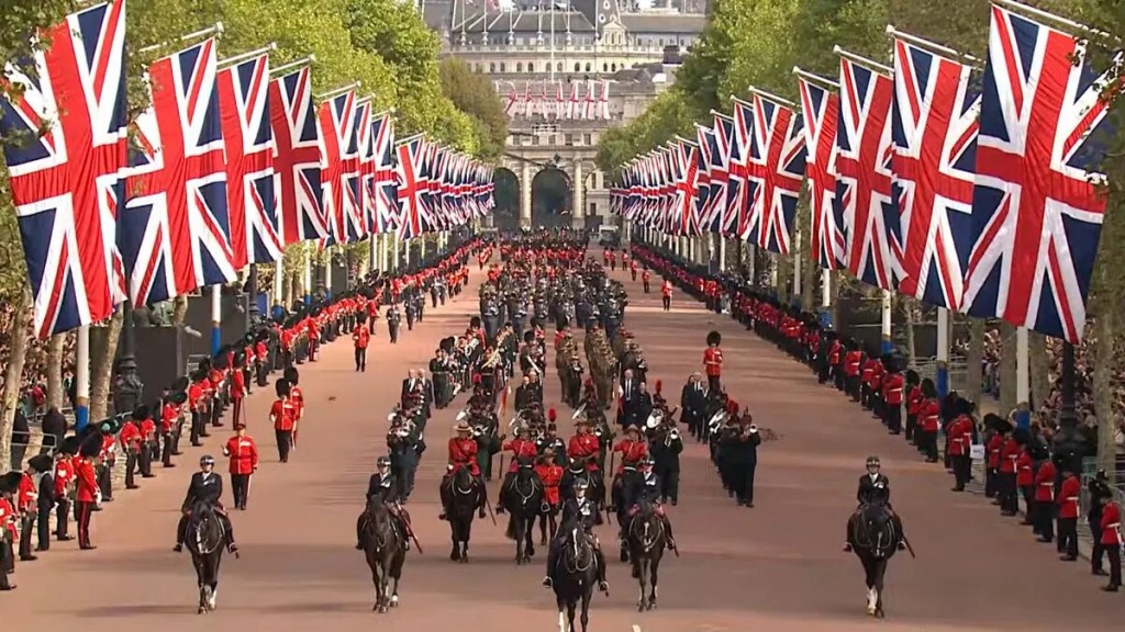 La segunda etapa del funeral de estado de la Reina Isabel II incluye una procesión por el centro de Londres. Desde la abadía de Westminster, su cuerpo es llevado por una cureña tirada por 200 efectivos de la Royal Navy (la marina real). El rey Carlos III y los demás miembros de la familia real acompañan el féretro de la reina.
