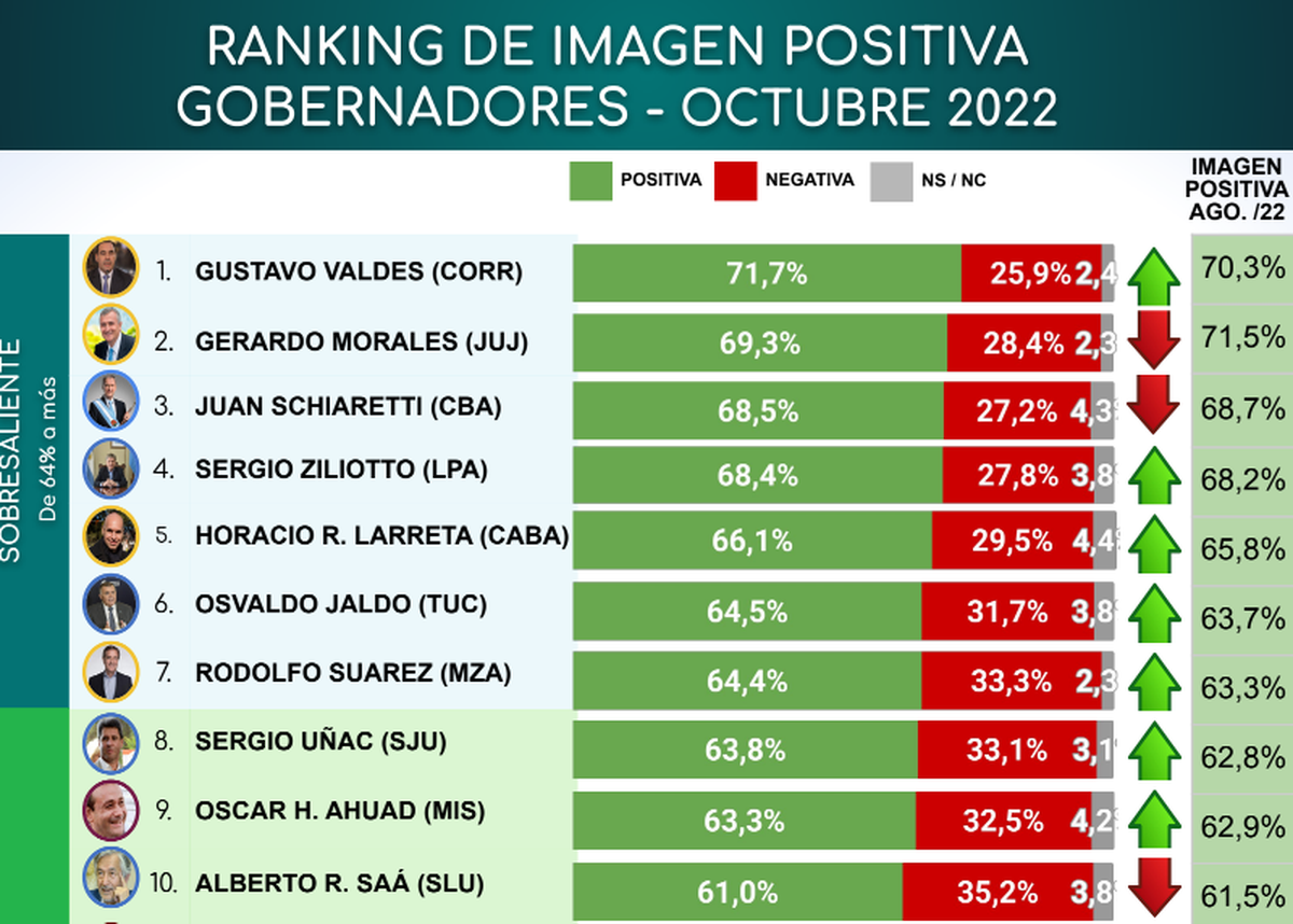 Los tres gobernadores mejor valorados del mes de octubre son: Gustavo Valdés (71,7%), Gerardo Morales de Jujuy (69,3%), y Juan Schiaretti de Córdoba (68,5%).