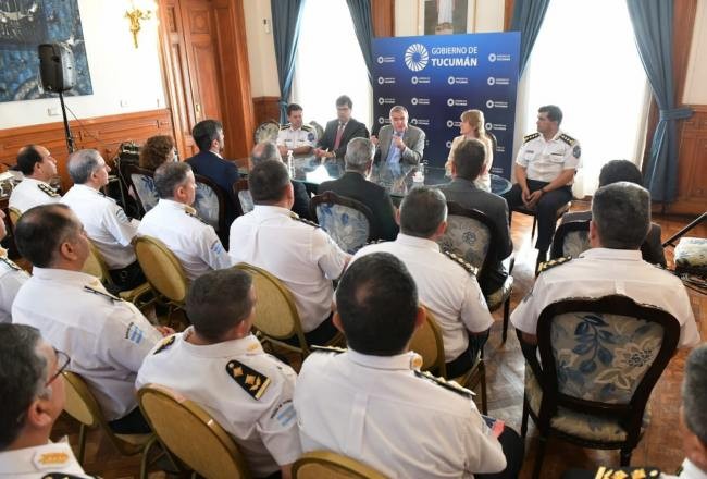 El gobernador, Osvaldo Jaldo, recibió esta mañana en el antedespacho de la Casa de Gobierno al ministro de Seguridad, Eugenio Agüero Gamboa; a representantes de diferentes áreas de la cartera y de la plana mayor de la Policía de Tucumán.