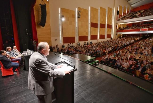 El gobernador, Osvaldo Jaldo, participó hoy del conversatorio "Ni un pibe menos por la droga", que organiza el padre José María "Pepe" Di Paola en el marco de una peregrinación encabezada por la organización "Hogares de Cristo", que se dictó en el teatro Mercedes Sosa.