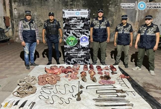 Además, encontraron cinco cuchillos, dos sierras, dos machetes, pinzas de corte, nueve hojas de sierra tipo carnicero de 50 cm, doce ganchos tipos carnicero, una balanza entre otros elementos utilizados para esta actividad.