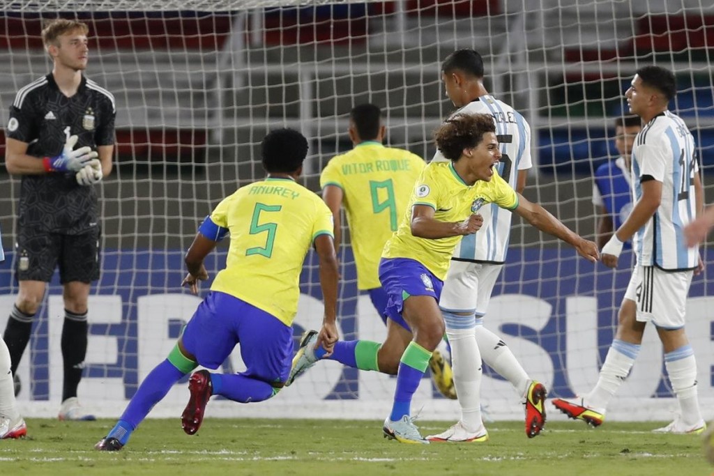 Ya a los 36, Máximo Perrone se confundió al tocar para atrás, robó Andrey Santos y todo terminó en un mano a mano para el 2-0 de Brasil.
