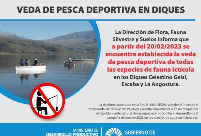 La Dirección de Flora, Fauna Silvestre y Suelos del Ministerio de Desarrollo Productivo informa que, a partir del 20 de febrero, se encuentra establecida la veda de pesca deportiva sobre todas las especies en los diques Celestino Gelsi, Escaba y La Angostura.