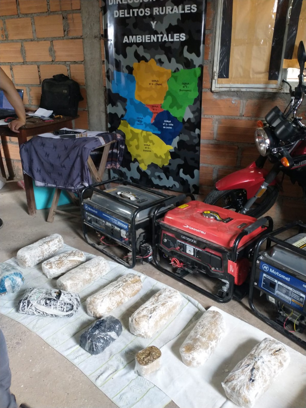Las tareas estuvieron coordinadas por el auxiliar de fiscal Facundo González, quien señaló que en el lugar se hallaron varios elementos que coinciden con los objetos denunciados. Fuentes del MPF indicaron que se procedió al secuestro de 4 grupos electrógenos, cubiertas de motovehículos, una motocicleta y automóvil ( ambos sin documentación), una pistola 9 milímetros y estupefacientes. Además se procedió a la aprehensión de un sujeto de 21 años.