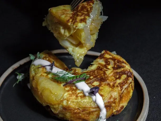 Tortilla de papas vegana: lleva papas doradas, cebollas caramelizadas, harina de garbanzos y “queso” de papa casero, y forma parte del tentador menú de brunch del restaurante Mudrá Plant Based.