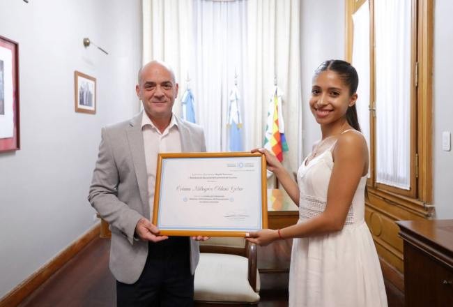 El ministro de Educación, Juan Pablo Lichtmajer, recibió en su despacho de Casa de Gobierno a Oriana Milagros Oldani Getar para reconocerla como Orgullo Tucumano por su trayectoria artística.