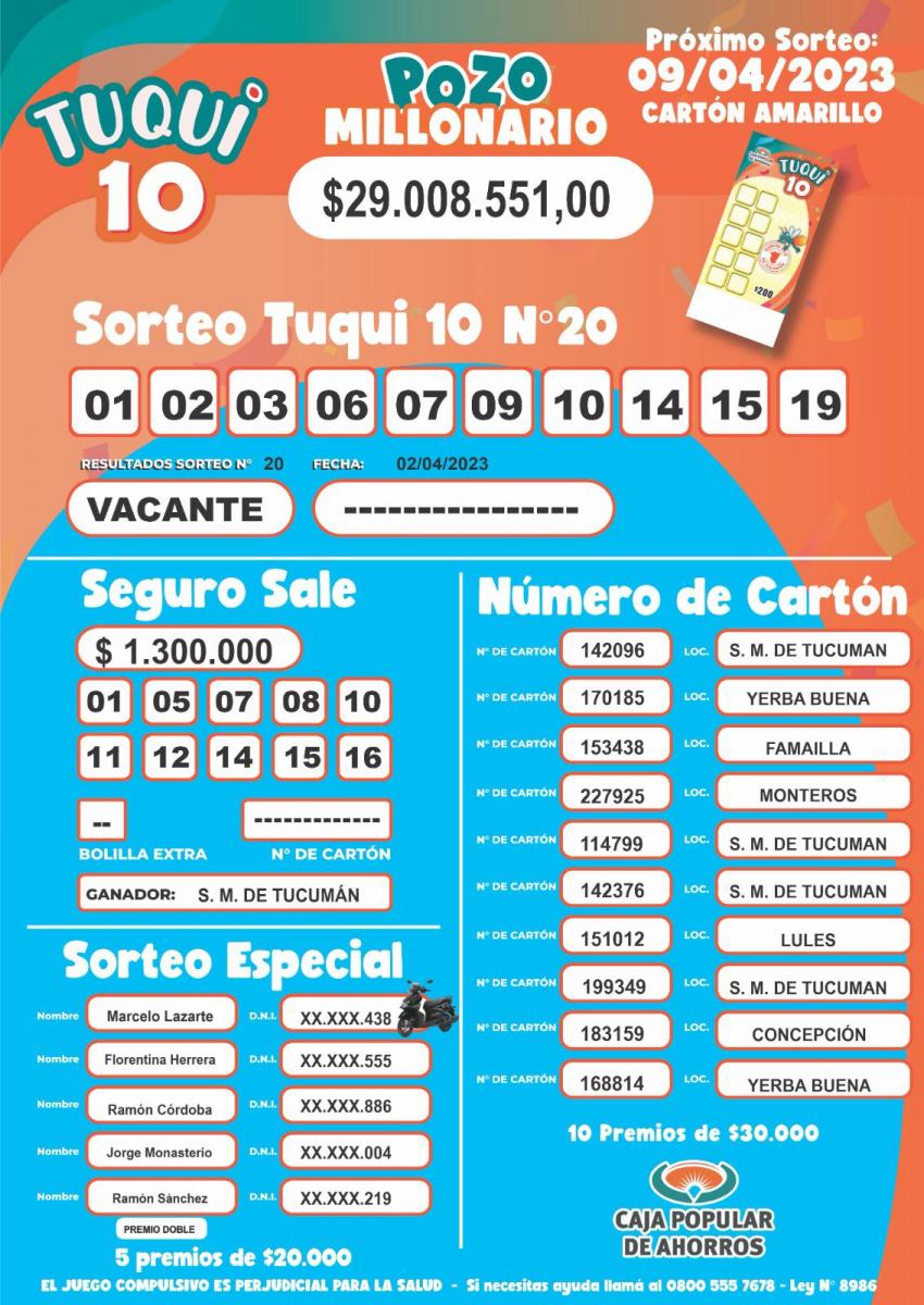 Además, como es habitual, la categoría "Seguro Sale" otorgó $1.300.000 y se sortearon 10 premios de $30.000 por número de cartón. Como novedad se sortearon por cuponera cuatro premios adicionales de $20.000 y una moto 0 kilómetros. A continuación, detallamos los resultados de las tres modalidades del Tuqui 10, el nuevo juego de azar de la Caja popular de Ahorros: