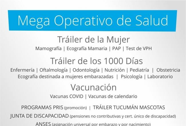 Finalmente, en el mismo espacio se suman al operativo los tráilers de Tucumán Mascotas y programas de la Dirección General del Programa Integrado de Salud (PRIS) encargados de concientizar en prevención y promoción de enfermedades, así como el Banco de Pelucas del Siprosa, la Junta de Discapacidad y ANSES para el asesoramiento y concreción en trámites como el de Certificado Único de Discapacidad, o los de asignación universal por embarazo y nacimiento.