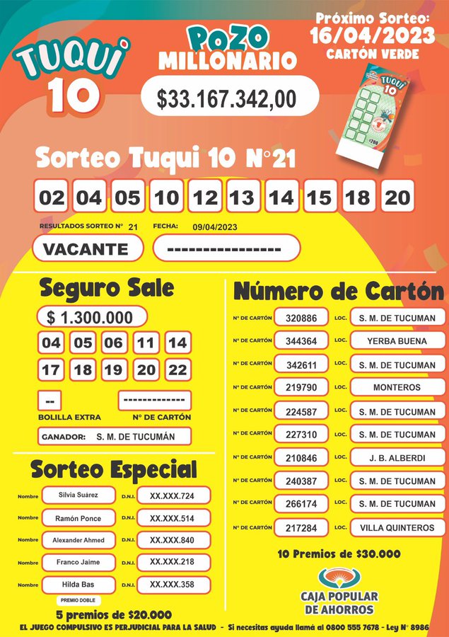 A continuación, detallamos los resultados de las tres modalidades del Tuqui 10, el nuevo juego de azar de la Caja popular de Ahorros.