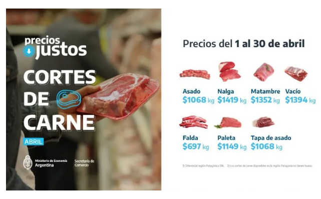Tras un ajuste del 3,2% respecto del mes pasado, el kilo de asado deberá ofrecerse a $1.068, el de nalga a $1.419, el de matambre a $1.352, el de vacío a $1.394, el de falda a $697, el de paleta a $1.149 y el de tapa de asado a $1.068. También continuarán vigentes las promociones en carnicerías de reintegro del 10% abonando con tarjetas de débito o crédito y del 35% para clientes de Banco Nación abonando con la aplicación Modo para las compras de los viernes y sábados.