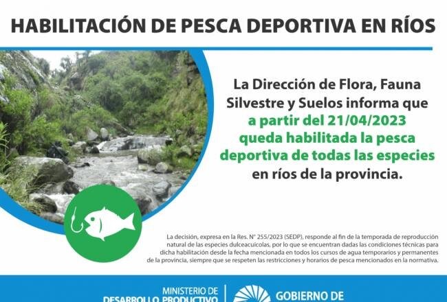 La Dirección de Flora, Fauna Silvestre y Suelos del MDP informa que, desde el día de la fecha, queda habilitada la práctica de pesca deportiva de la totalidad de especies dulceacuícolas en todos los ríos / cursos de agua permanentes y temporarios de la provincia. La Resolución 255/2023 (SEDP) está fundamentada en razón de la finalización de la temporada de reproducción natural de las especies.