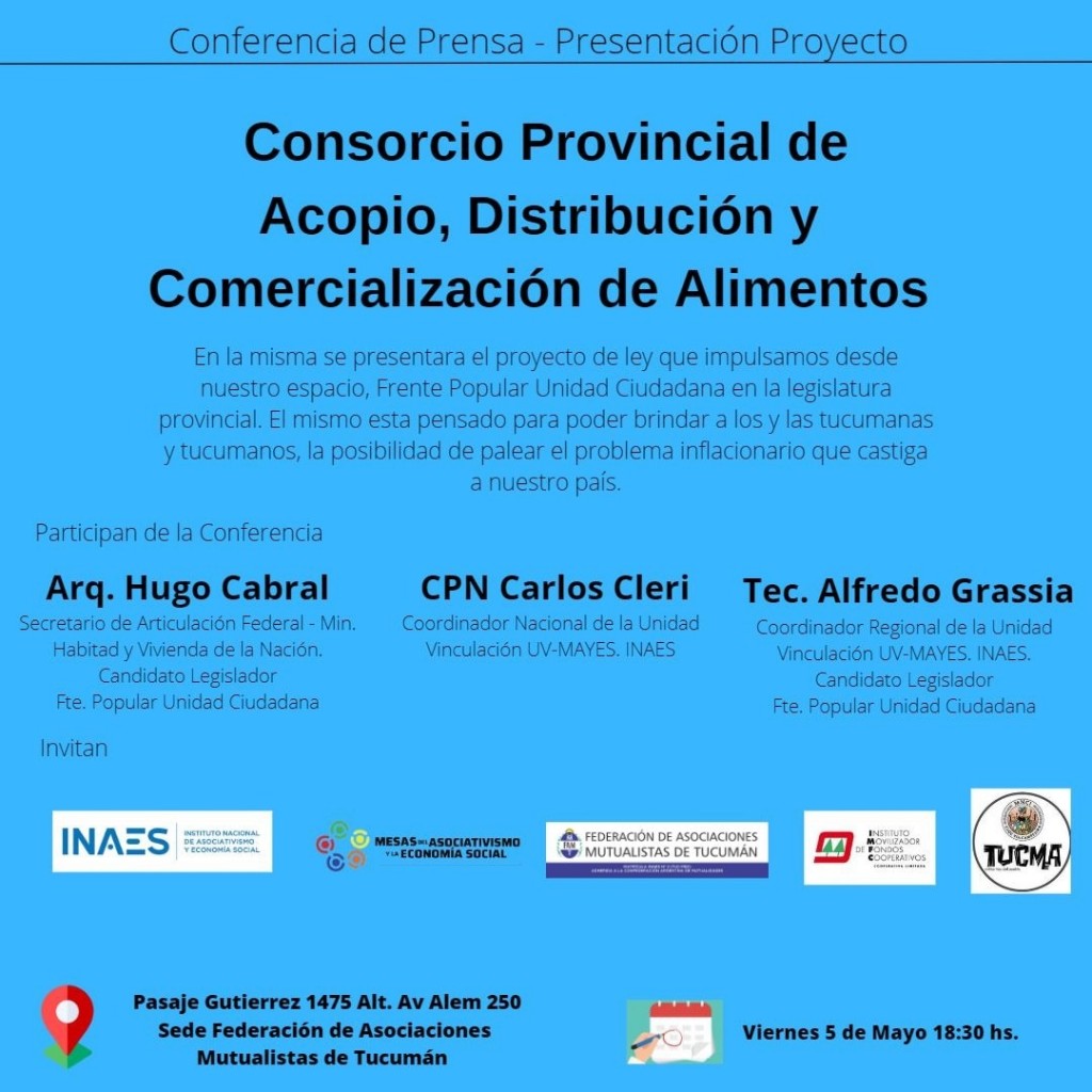 El Consorcio Provincial de Acopio, Distribución y Comercialización de Alimentos es el proyecto de Ley que se presentará este viernes a las 18.30, donde disertará Carlos Cleri acompañando a el arquitecto Hugo Cabral y el economista Alfredo Grassia, ambos candidatos a legislador, en la conferencia que presentará el Proyecto de Ley impulsado por el Frente Popular Unidad Ciudadana.