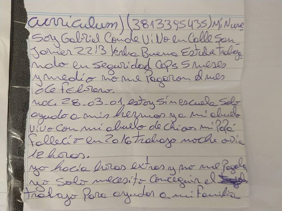 El joven dejó la escuela en quinto año, se desempeñó como Seguridad en una empresa, pero como a muchos no le alcanza. Gabriel resume su vida en 14 renglones, en una hoja de cuaderno, esto ha conmovido a los tucumanos que empezaron a viralizarlo en las redes.