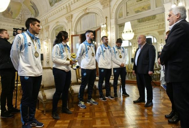 El gobernador, Juan Manzur, se reunió en el Salón Blanco con los jugadores de cestoball Pablo Véliz y su hermano Federico, Maximiliano Cuva, Gonzalo Suárez y la entrenadora de la Selección Argentina Masculina de Cestoball, Melina Véliz. Ellos son los cinco tucumanos, parte del equipo nacional que consagró a la Argentina como campeona en el primer Mundial de este deporte en Bangalore, India.