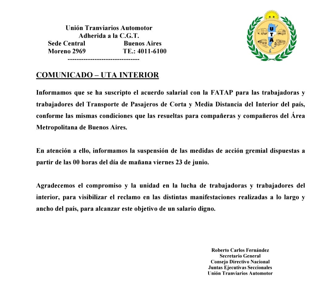 Y desde UTA anunciaron que la circulación de los colectivos será normal este viernes en la provincia. El anuncio se hizo a través de un comunicado, el mismo indica que "se ha suscripto el acuerdo salarial con la FATAP para las trabajadoras y trabajadores del Transporte de Pasajeros de Corta y Media Distancia del Interior del país, conforme a las mismas condiciones que las resueltas para compañeras y compañeros del Área Metropolitana de Buenos Aires.
