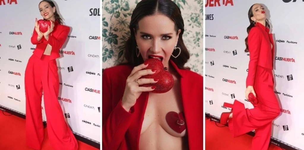 El detalle de su outfit fue que no llevó corpiño y cubrió sus pechos con unos parches de látex en forma de corazón. Además, completó su look con un clutch rojo y brillante también con forma de corazón, al igual que su anillo, aunque éste de color plateado.