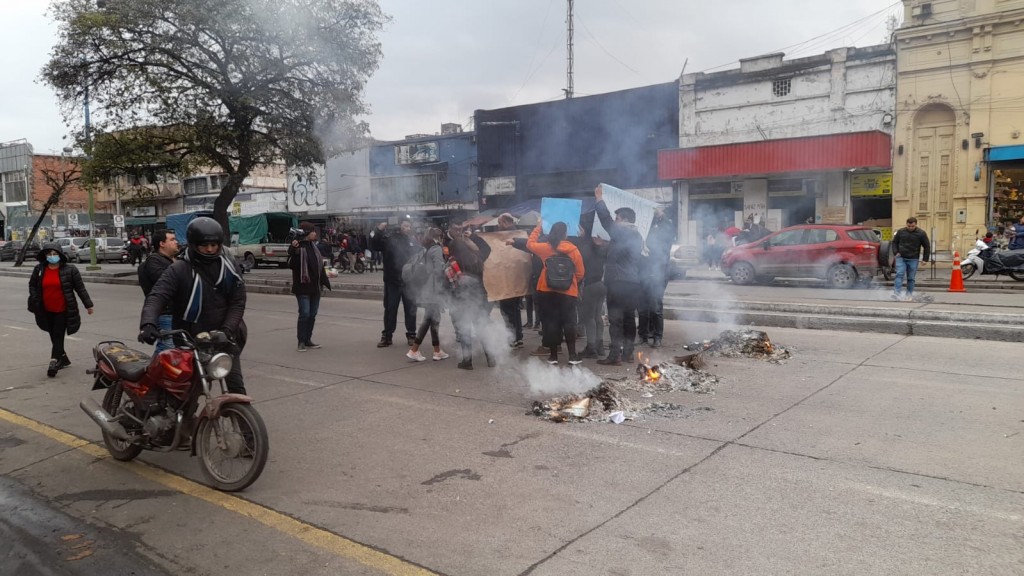 Los empleados del Sutrappa, Sistema Único de Transporte Público de Pasajeros en Automóvil, reclaman en avenida Sanz Peña primera cuadra este miércoles Federico Erazzú, uno de los empleados de la entidad, precisó: "Tenemos sueldos que llegan a los $22.000 mensuales, tenemos que rebuscarnos por otros medios para poder pagar el alquiler, es un monto que no alcanza ni para un fin de semana".