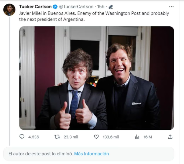 “Javier Milei en Buenos Aires. Enemigo del Washington Post y probablemente el próximo presidente de Argentina”, posteó Carlson en la red social X (otrora Twitter) que compró Musk.
