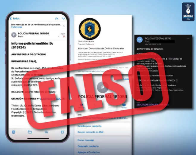 La SOC advirtió a la población que los correos electrónicos fraudulentos se pueden identificar con alguno de los siguientes asuntos: “DENUNCIAS DE DELITOS FEDERALES – SOLICITAR QUE SE CITE AL DEMANDADO, CITACIÓN POLICIAL ELECTRÓNICA”. Y agregó que estos emails provienen de cuentas de correos falsas que intentan suplantar la identidad de la Policía Federal Argentina.