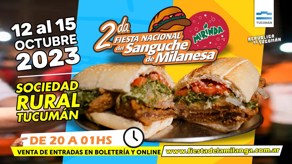 Del 12 al 15 de octubre, de 20 a 01, La Rural volverá a abrir sus puertas para recibir a las mejores sangucherías de la provincia y a miles de personas ávidas de saborear la emblemática milanga. Vale destacar que la 2ª Fiesta Nacional del Sanguche de Milanesa, organizada por Diego Viruel.