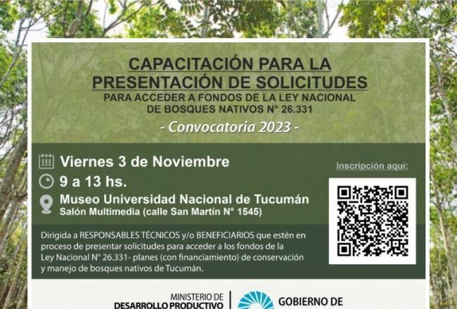 La Subdirección de Ordenamiento Territorial de Bosques Nativos (OTBN) del MDP invita a RESPONSABLES TÉCNICOS y/o BENEFICIARIOS que estén en proceso de presentar solicitudes para acceder a los fondos de la Ley Nacional N.º 26.331- planes (con financiamiento) de conservación y manejo de bosques nativos de Tucumán a participar de una capacitación, de modalidad presencial, sobre dicha presentación.