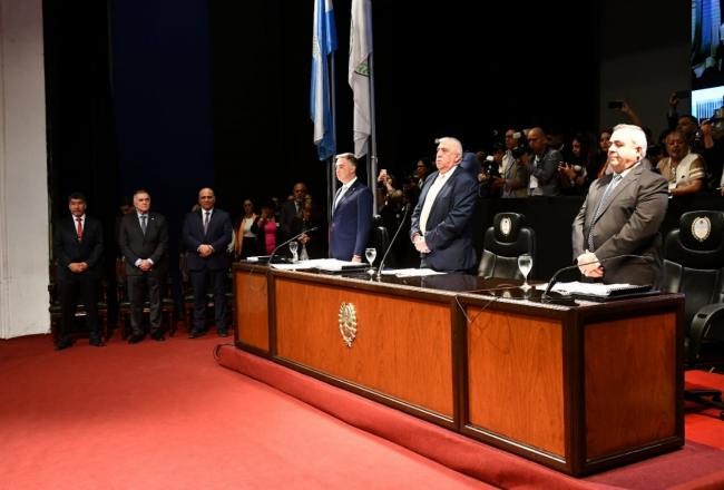 Osvaldo Jaldo, gobernador electo, acompañado del gobernador, Juan Manzur, participaron este sábado por la mañana, en el Teatro San Martín, de la jura de los legisladores electos el 11 de junio, quienes asumieron en sus bancas conformando la Legislatura con 19 representantes de la Sección Capital, 18 del Oeste y 12 del Este.