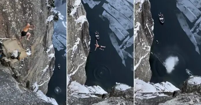 El noruego Ken Stornes batió un récord mundial luego de realizar un salto hacia las heladas aguas de un lago en la ciudad de Styrn, Noruega, desde una altura de 40.5 metros y la proeza del denominado “vikingo de la naturaleza” dio la vuelta al mundo con la impactante imagen del hombre lanzándose al vacío desde una plataforma ubicada en un acantilado.
