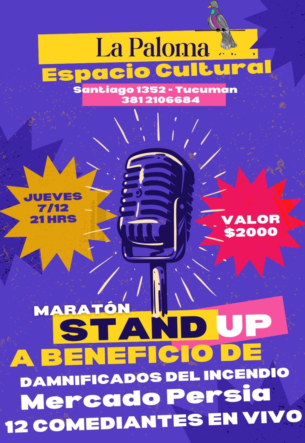Ana Hynes O'Connor, reconocida actriz y docente de teatro, y organizadora de la Maratón de Stand Up a beneficio de los damnificados del incendio en el Mercado Persia, en La Gran Mañana, explicó que, "la función va a ser este jueves 7 de diciembre a las 21 horas, en la Sala 'La Paloma', es nueva, es un espacio hermoso, cuenta dos salas, aulas para dar talleres, y apoyar a la cultura tucumana como son los espacios nuevos, una emprendedora, una colega de la facultad de teatro compañera está poniendo su espacio a beneficio de esta función, esperamos que salga todo bien, para eso es necesario que vaya la gente más que nada, es en la Santiago 1352 es casi Mitre es nuevo el espacio por eso a nadie le suena, nos ayuda mucho que nos ayuden a difundir para que se vaya generando también el público a la sala y también desde ya una puesta al humor frente a esta desgracia tan grande que ha pasado esta gente, es un poco resistir en grupo".
