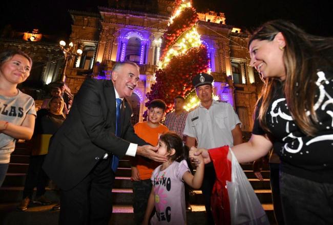 El gobernador presenció el alumbramiento del árbol de navidad que se instaló en las escalinatas de Casa de Gobierno en vísperas de las fiestas de fin de año.