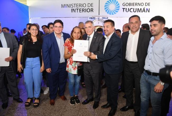 "Es un día especial para los habitantes de la provincia de Tucumán, donde se llevó a cabo la entrega de 550 escrituras a cada vecino de diferentes localidades del interior", sostuvo Jaldo.