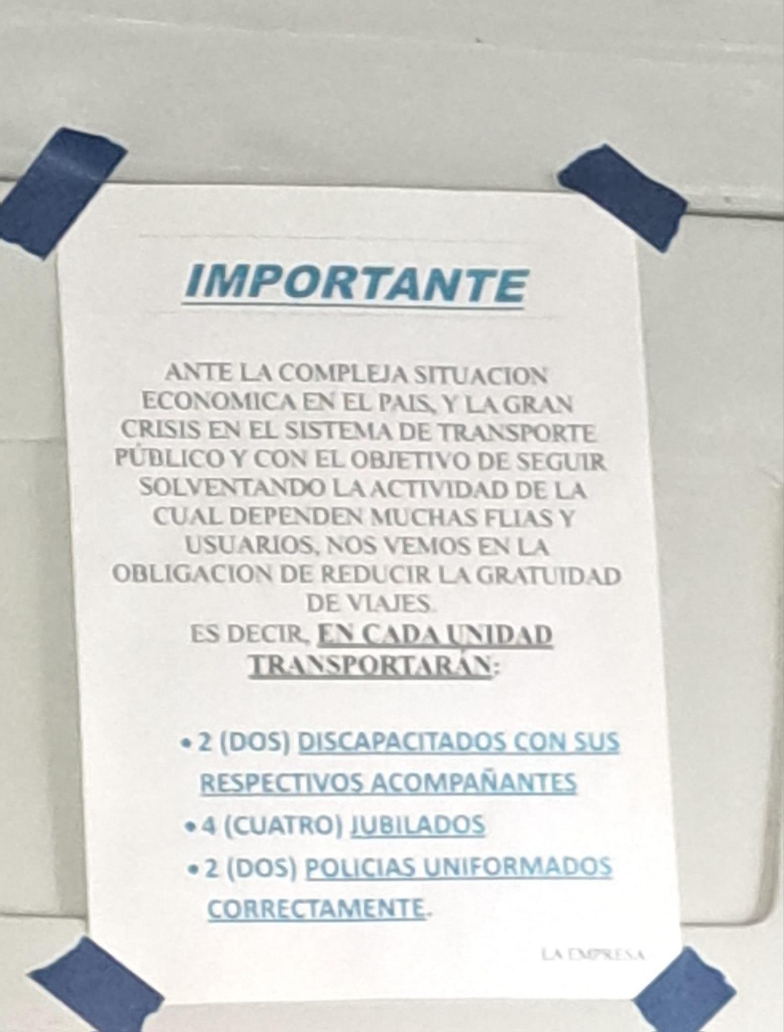 En los últimos días se pudo ver en una línea de colectivos un "cartel" en las unidades que informaba un límite para el traslado de discapacitados, jubilados (el 50% del boleto lo pagamos con nuestros impuestos) y Policias en Tucumán. Se trata de la empresa Agua Dulce, que recorre el interior, el motivo por el que toman esta medida, según la empresa, es la "gran crisis en el sistema de transporte público”.