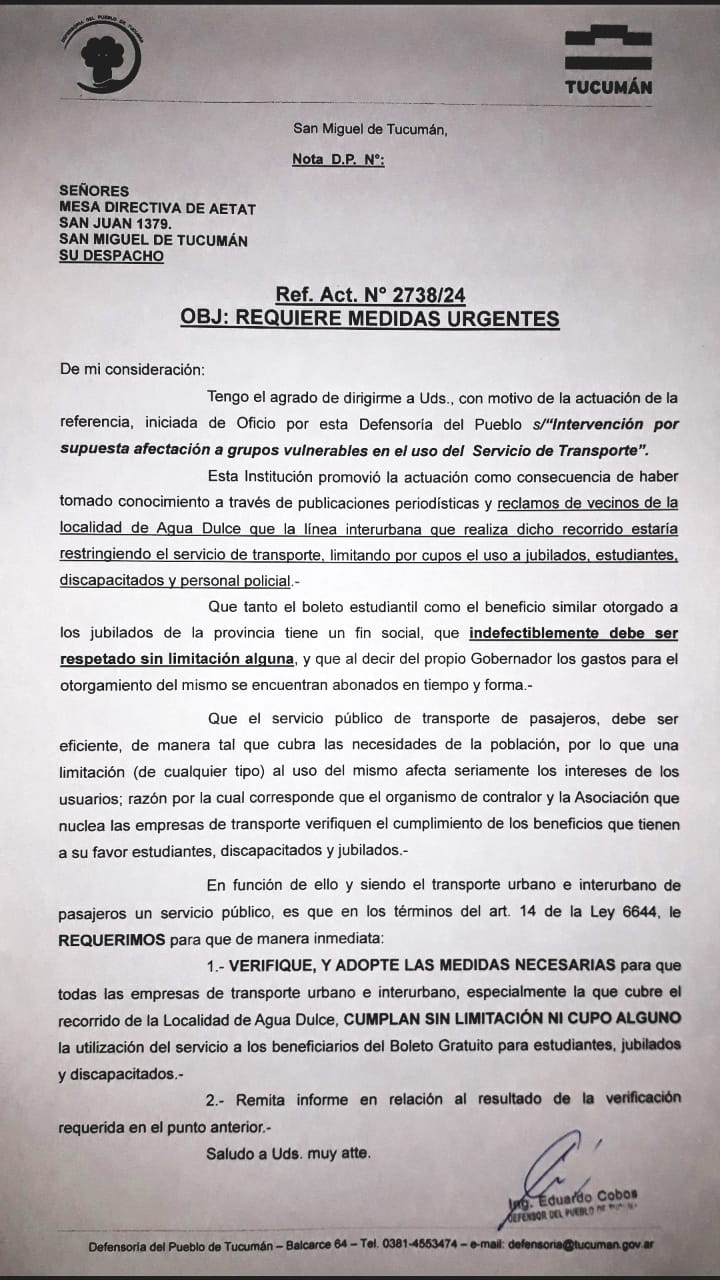 Ante esta situación desde la Defensoría del Pueblo, conducida por el ingeniero Eduardo Cobos, emitieron una nota en la que piden que se cumpla con los usuarios que tienen boleto gratuito, estudiantes, jubilados y discapacitados.