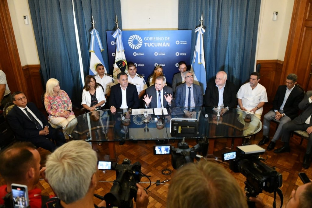 El mandatario tucumano, acompañado por todos los ministros del Poder Ejecutivo provincial, en una conferencia de prensa celebrada en Casa de Gobierno, recordó que por la quita momentánea del Impuesto a las Ganancias, el Incentivo Docente y la Compensaciones al Transporte este año no percibiremos 130 mil millones de pesos.