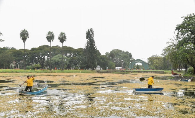 En el marco del Plan de Revalorización del Parque 9 de Julio, encabezado por el paisajista Carlos Thays, operarios de distintas direcciones de la Secretaría de Servicios Públicos trabajaron incansablemente a pesar del mal tiempo. Buscan que el espejo de agua recupere todo su esplendor.
