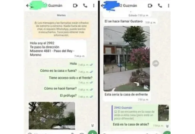 La mujer dio aviso a la Policía de Buenos Aires a través de un mensaje de WhatsApp y en las últimas horas los chats se hicieron públicos. “Hola, soy el 2992. Te paso la dirección. Miserere 4881 -Paso del Rey- Moreno”, se lee en el texto que llegó a las 7:44 al teléfono del Programa Nacional de Recompensas.