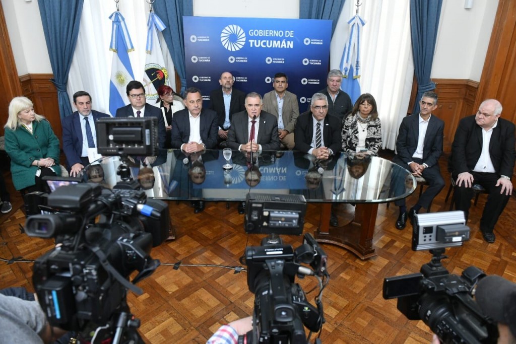 El gobernador Osvaldo Jaldo celebró esta mañana en conferencia de prensa la sanción en general de La Ley Bases y el Acuerdo Fiscal que posibilitaron este miércoles los senadores de la Libertad Avanza y aliados, en un maratónico debate, destacó que la aprobación “da seguridad jurídica al país”, repudió los hechos vandálicos que perpetró un minúsculo grupo no identificado, felicitó a las senadoras Beatriz Avila (Bloque por la Justicia Social) y Sandra Mendoza (Unión por la Patria) “por pensar en Tucumán” y aseguró que los recursos coparticipables que ingresarán al aprobarse títulos de la normativa “serán volcadas para reactivar obras públicas” ya que los gastos de funcionamiento “se están cubriendo con recursos propios presupuestarios”.
