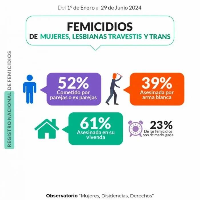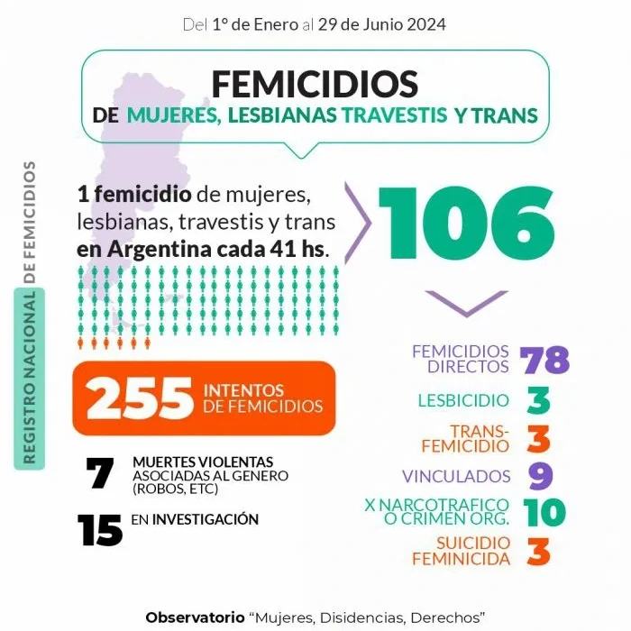 El informe del Observatorio Mujeres Disidencias Derechos de MuMaLa reveló las formas más extremas de violencia de género ocurridas en todo el territorio argentino entre el 1 de enero y el 29 de junio de 2024. Durante este periodo, se registraron 106 femicidios, lo que equivale a un femicidio cada 41 horas. Como consecuencia, 94 niños, niñas y adolescentes quedaron huérfanos de madre.