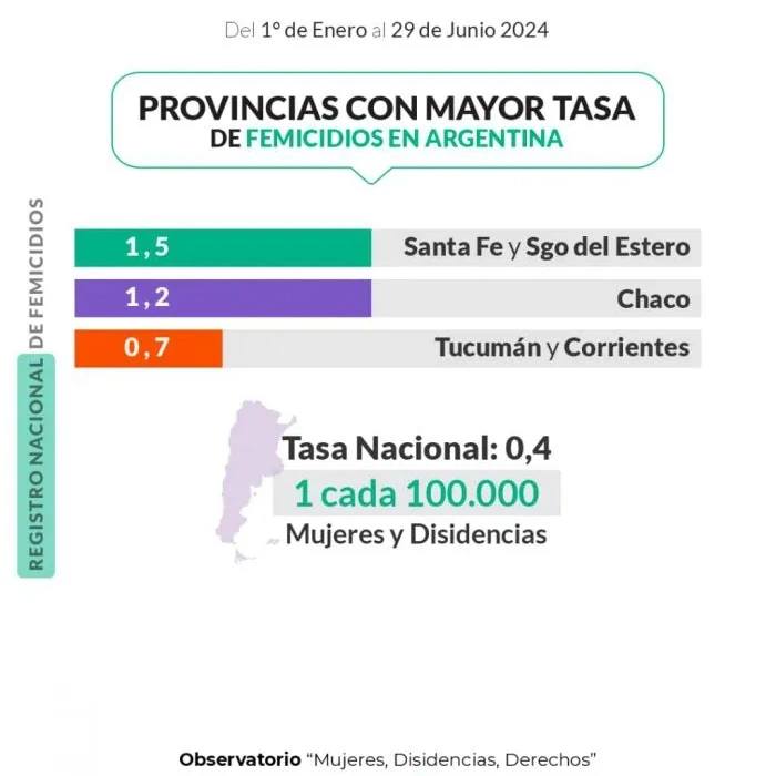 Las provincias con las tasas más altas de femicidios al 29 de junio de 2024 son Santiago del Estero, Santa Fe, Chaco y San Luis.