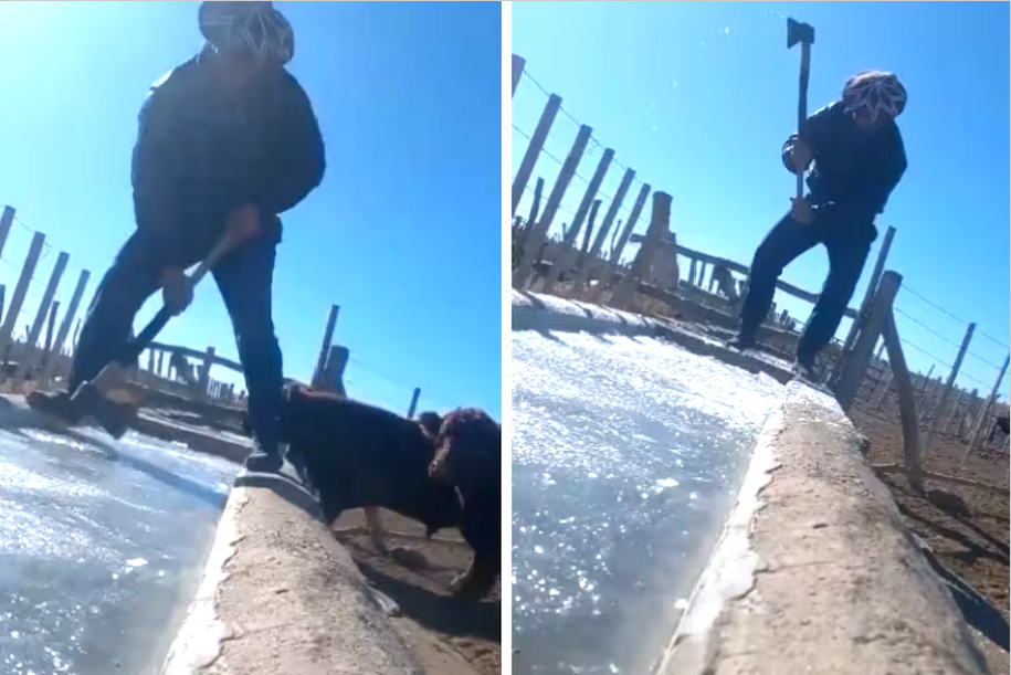 En la imagen se observa a un trabajador rompiendo con un hacha un bebedero de agua que se congeló producto de las bajas temperaturas. Según trascendió, las imágenes son del campo Las Delicias, en el partido de General La Madrid, en el sudoeste de la provincia de Buenos Aires. En el clip se observa a una persona mientras rompe la estructura gruesa por los costados para intentar diluir el hielo poco a poco y descubrir el agua para los animales. En rigor, en muchos lugares por el frío extremo ocurrió este fenómeno y los productores tuvieron que recurrir a romper la capa de hielo.