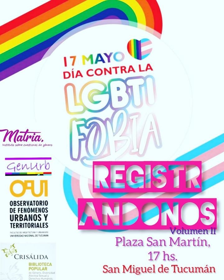 La biblioteca popular Crisálida de género y diversidad afectivosexual y el Nodo Género y Urbanismo del Observatorio de Fenómenos Urbanos de la Facultad de Arquitectura de la UNT, con el apoyo de Matria, instituto sobre cuestiones de género; realizará un nuevo encuentro del proyecto "RegistrAndonos" que consiste en recorrer tramos de San Miguel de Tucumán, realizando registros con celulares para abordar urbanismo desde una perspectiva de género. La convocatoria es en plaza San Martín el viernes 17 de mayo a 17 hs con el recorrido que realizó la primera marcha del Orgullo de Tucumán en 2010.