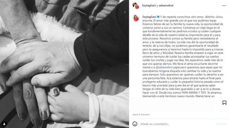 “El amor más grande con el que nos pudimos topar. Estamos felices de ser tu familia, tu nueva vida, la oportunidad de construir junto a vos un camino. Comienza un viaje largo en el que fundamentalmente les pedimos a todos que cuiden cualquier detalle de la vida de nuestro bebé, es importante para él y para este proceso”, indicó.