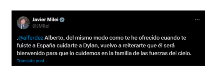 De manera irónica Javier Milei posteó en su cuenta de X: “Alberto, del mismo modo como te he ofrecido cuando te fuiste a España cuidarte a Dylan, vuelvo a reiterarte que él será bienvenido para que lo cuidemos en la familia de las fuerzas del cielo”.