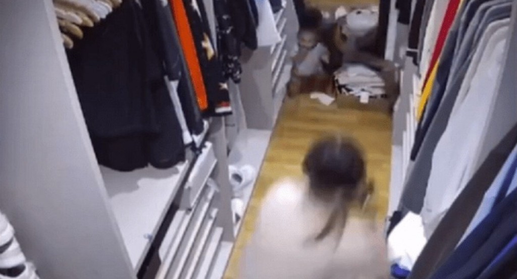 La influencer publicó un clip grabado por las cámaras de seguridad de su hogar, en el que se puede apreciar cómo Theo se acerca a un espejo enorme, que comenzó a tambalear.